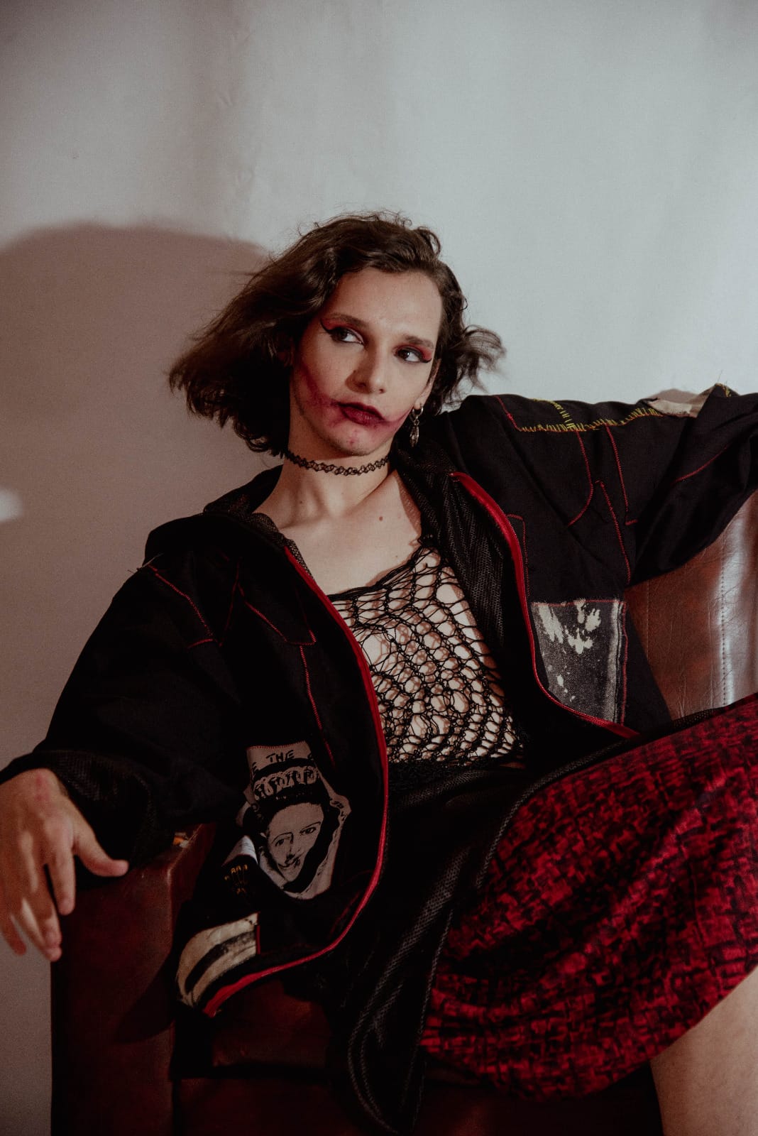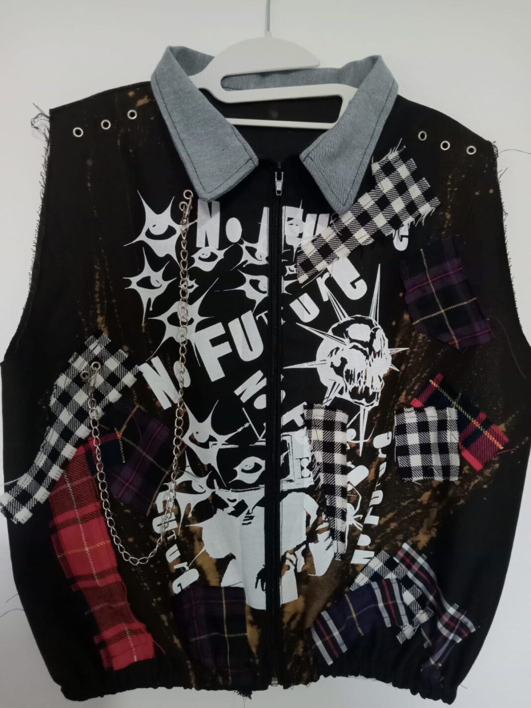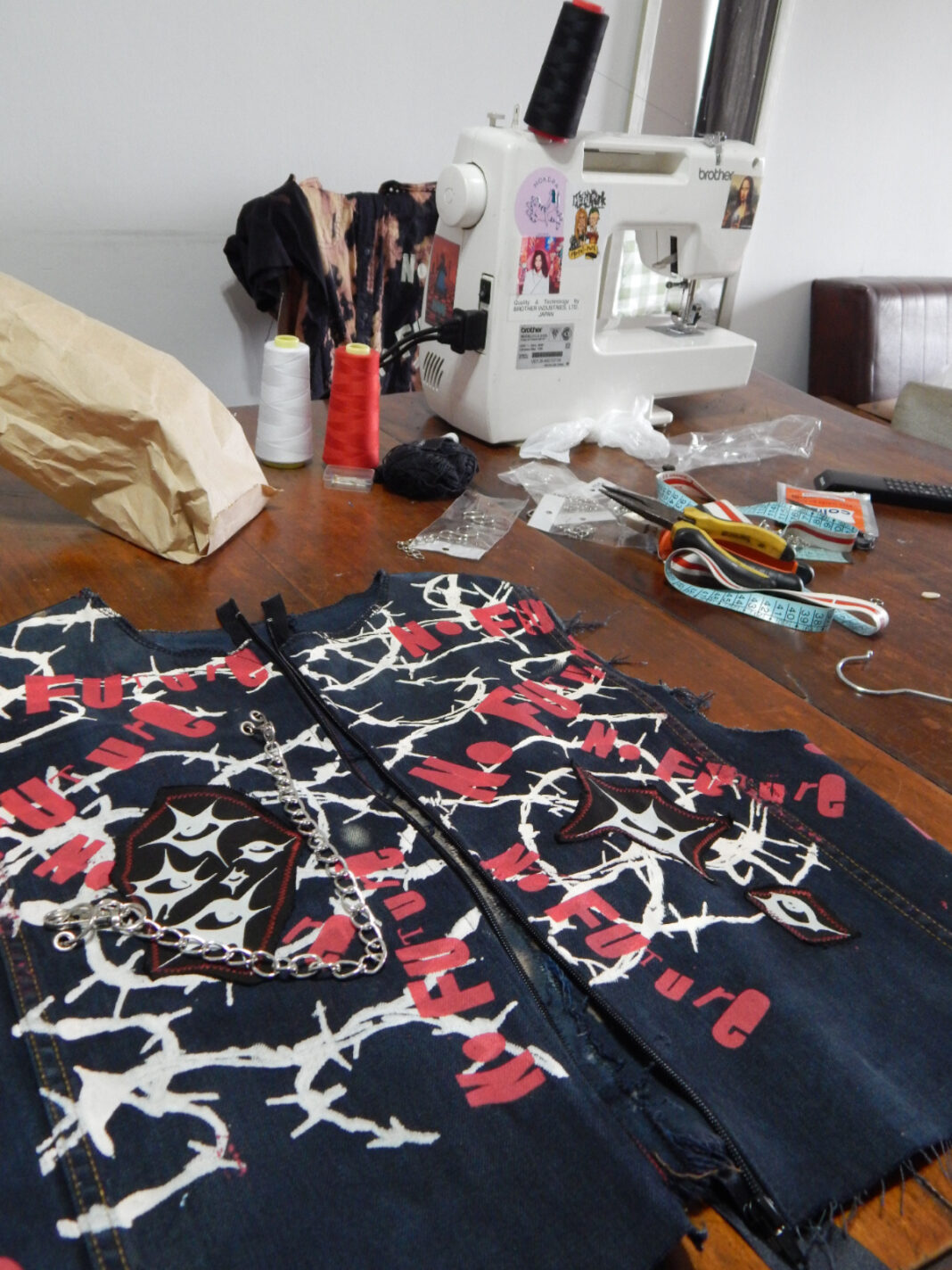 El punk, en su propuesta, es tanto estética como actitud. “La crisis política que comenzamos a atravesar cuando estaba por recibirme… me llevó a volver al punk y a sus ideales”, dice. Pero el punk no llega solo: llega junto a la reflexión sobre el fast fashion, la apertura de importaciones y la necesidad de crear con materiales reciclados y producción lenta. “Producir de una forma mucho más lenta a la que nos tiene acostumbrados el mercado es una manera de resistir”, asegura.